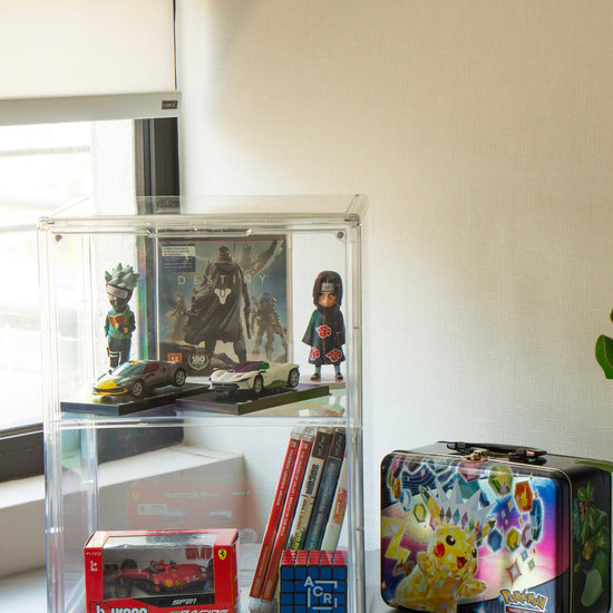 Gracias a su estructura apilable y piso removible, puedes ajustar la altura según el tamaño de tus figuras o combinar varias unidades para crear una vitrina completa. El acrílico de alta calidad ofrece visibilidad total y protección contra el polvo.
